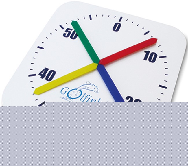 Ścienny zegar basenowy treningowy Golfinho E539. Wykonany z włókna szklanego. Bez przedniej osłony. Podłączany do sieci 220 V. Skrzyżowane wskazówki w czterech różnych kolorach. Wymiary: 80×80 cm.