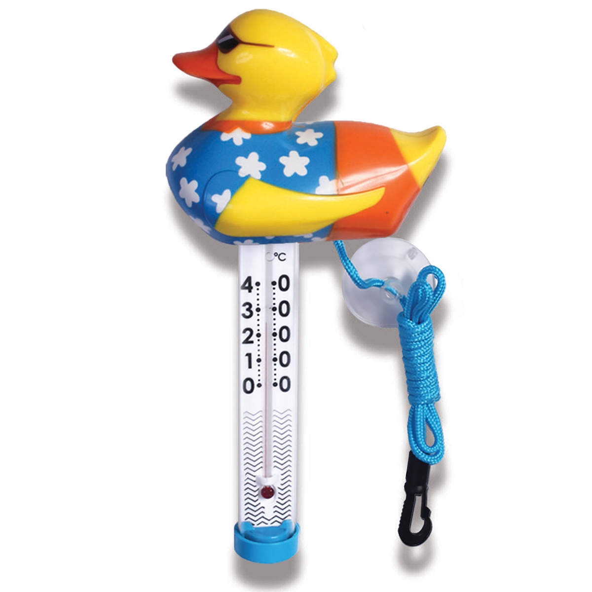 Termometr zabawkowy Kokido TM08CB/18 Kaczka Holiday jest wykonany z odlewanego tworzywa sztucznego i gumy o wysokiej wytrzymałości. Wyposażony w sznurek do mocowania i przyssawkę, dzięki którym można go przymocować do drabinki lub ściany basenu. Posiada jedną skalę – Celsjusza. Nie zawiera ftalanów.